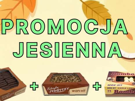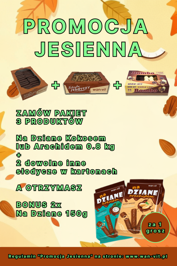 Organizatorem akcji o nazwie „ PROMOCJA JESIENNA ”, zwanej dalej „Promocją”, jest Z.P.H.U. „WAN-VIT” Wanda Grzebyta , ul. 3 Maja 11 B z siedzibą w 88-430 Janowiec Wielkopolski NIP: 562-100-07-37 , Celem akcji jest promocja wyrobów firmy WAN-VIT „ Na Dziane Arachidem w polewie kakaowej „ „Na Dziane Kokosem w polewie kakaowej” w opakowaniach o wadze 0,8 kg oferowanych i dostępnych u naszych dystrybutorów w punktach sprzedaży hurtowej na całym obszarze Rzeczypospolitej Polskiej. Czas trwania Promocji obejmuje okres od 30 października 2025 roku do 31 grudnia 2025 lub do wyczerpania stanów magazynowych. §2 BONUS BONUS PROMOCJI w formie 2 sztuk : „ Na Dzienne Arachidem 150g „ + „Na Dziane Kokosem 150 g „ o wartości 1 grosza każdy. przy zakupie PAKIETU 3 DOWOLNYCH OPAKOWAŃ produktów w tym: „ Na Dziane Arachidem w polewie kakaowej „ 0,8 kg lub „Na Dziane Kokosem w polewie kakaowej” 0,8 kg lub GRAHAMKI , CHRUPKI , PALUCHY , SĘKACZE , CIEPŁE LODY .